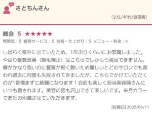 さとちんさま。嬉しい口コミありがとうございます☆技術だけでなく、接客にもご満足いただけてとても嬉しいです!丁寧に髪質を診断し、薬剤の選定をするように心がけております。これからも、さとちん様のお悩みやご要望にお応えできるように全力でサポートさせていただきます☆お気軽にお申し付けくださいね!私も、さとちん様にお会いできるのを楽しみにしております♪