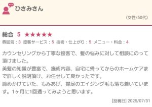 ひさみ様。先日はご来店いただきありがとうございました。もみあげや襟足も落ち着いているとのことで安心しました。次回もしっかりカウンセリングさせていただきながら施術をさせていただきますね。今後も美髪にするサポートをさせていただきますので次回もお会いできる日を楽しみにしております。
