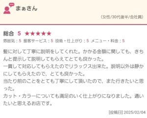 まぁ様。クチコミありがとうございます。ご満足頂けて大変嬉しく思います。今後も理想の髪の毛になれるようにご提案させて頂きご満足いただけますよう努めてまいります