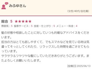 みふゆ様。いつもご来店くださり、嬉しい口コミまでありがとうございます!技術だけでなく、接客にもご満足していただけてとても嬉しいです!本当に艶々サラサラで美しい髪ですね!