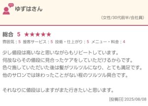 ゆずは様。この度はご来店、そして嬉しい口コミをありがとうございます。『他サロンでは味わったことのないツルツル具合』というご感想をいただきとても嬉しく思います。これからも髪を美しく、健康を保つためのサポートができればと思います。お悩みなどございましたらお気軽にお申し付けください。ゆずはさまのご来店心よりお待ちしてます。