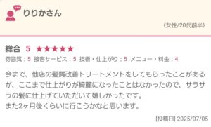 りりか様。先日はご来店いただき有難う御座いました。仕上がりにご満足いただけたとのことで、大変光栄です!りりか様の髪がサラサラに整い、喜んでいただけたことが何より嬉しく、私たちの励みになります。また2ヶ月後のご来店も、心よりお待ちしております。季節や髪の状態に合わせて、より最適なご提案をさせていただきますね。次回もりりか様にお会いできる日を楽しみにしております。