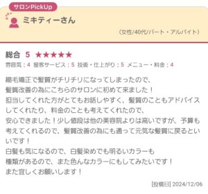 安心できました!少し値段は他の美容院よりは高いですが、予算も考えてくれるので、髪質改善の為にも通って元気な髪質に戻るといいです!