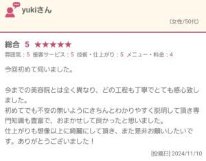 yuki様。先日はご来店いただきありがとうございました。初めての美容室は不安もあったかと思いますが仕上がりに満足いただけて嬉しいです。今後もカウンセリングや施術説明をさせていただき髪や頭皮のお悩みに対してサポートさせていただきます!また次回お会いできる日を楽しみにしております。